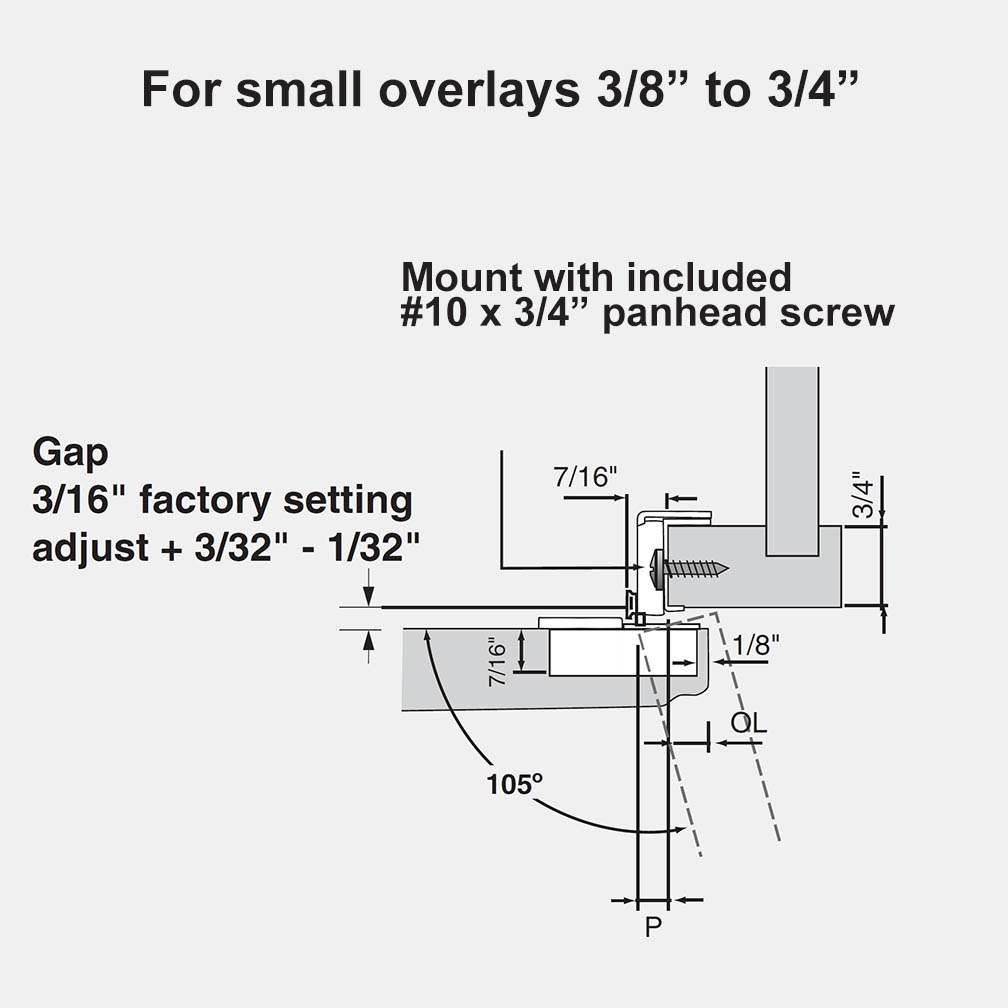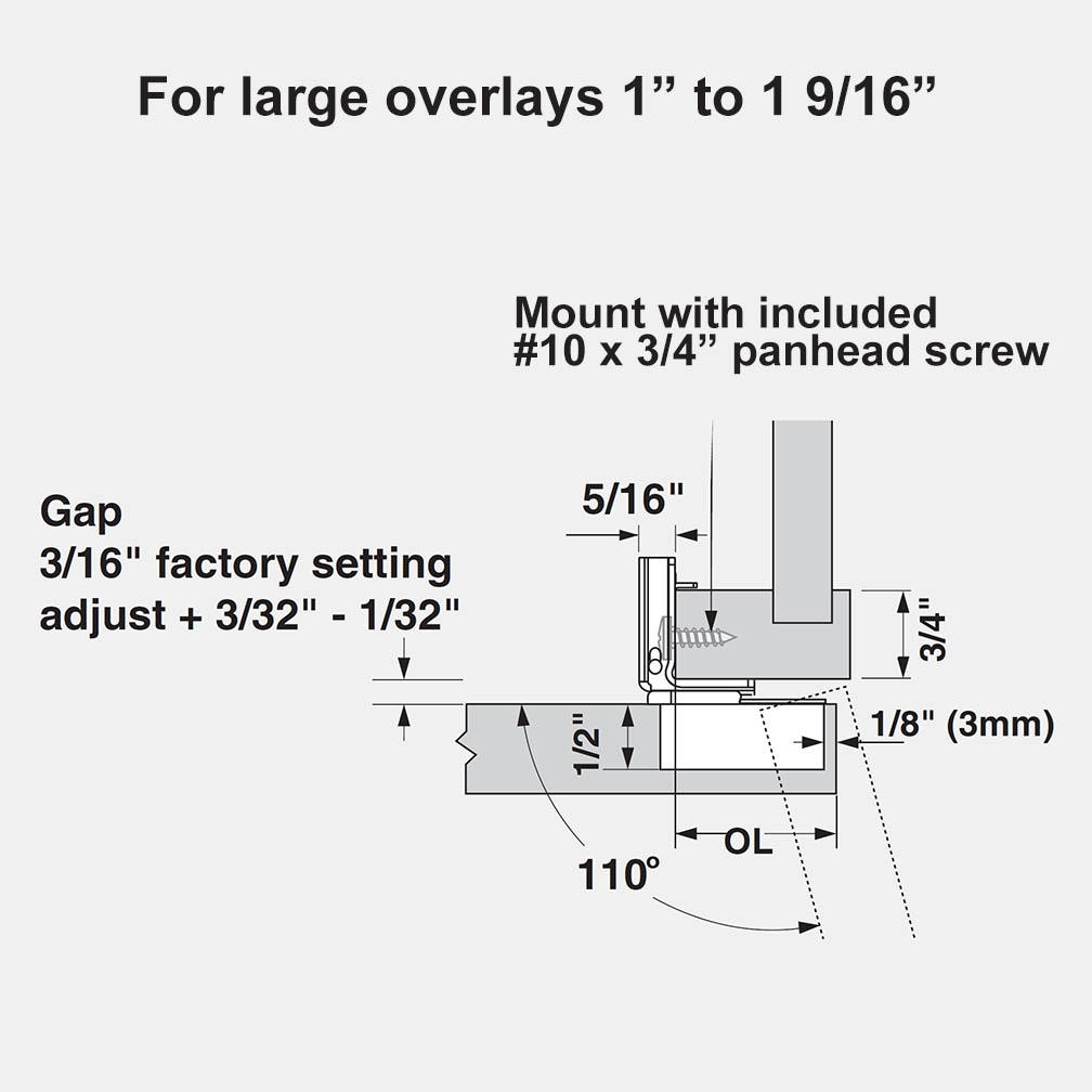 This Blum premium one piece face frame hinge has a 3 way adjustment to help you easily position your cabinet doors. The self-close feature will keep the door closed and the soft-close feature will prevent door banging by gently pulling the door to a closed position. All screws necessary for installation are included (one #10 x 3/4″ and two #6 x 5/8″). Our doors 42″ and under are drilled for two hinges and over 42″ for three hinges.