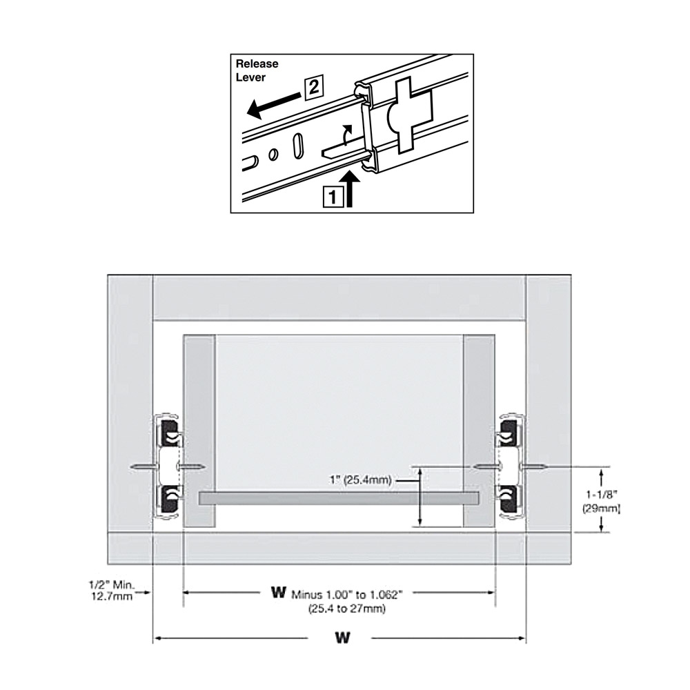 Our 5/8″ maple drawer box width should be [cabinet opening minus 1″] when used with these slides.