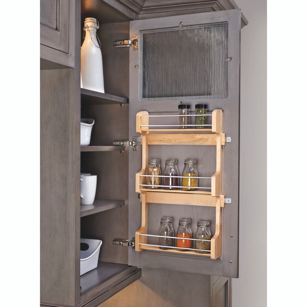 This attractive maple hardwood spice rack keeps spices within easy reach. The door mount brackets provide 5″ of side to side adjustment to ensure that screws mount into door stiles. It installs with just four screws